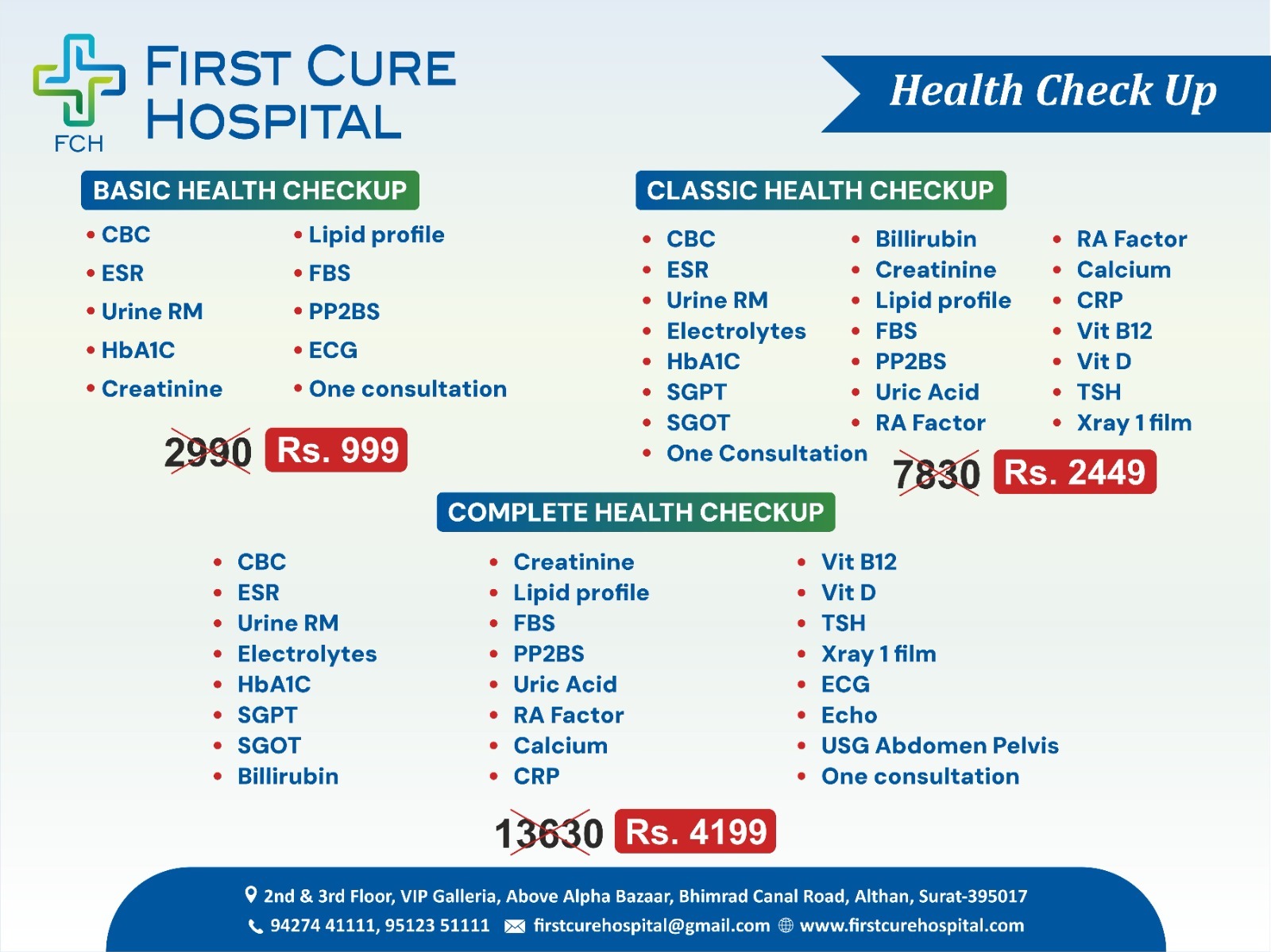Choose from Basic, Classic, or Complete Health Check-Up Packages at First Cure Hospital — designed for preventive and complete care. From essential tests to advanced diagnostics like ECG, X-ray, Echo, and USG, get everything you need for early detection at affordable prices.